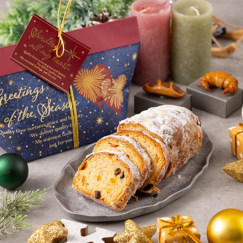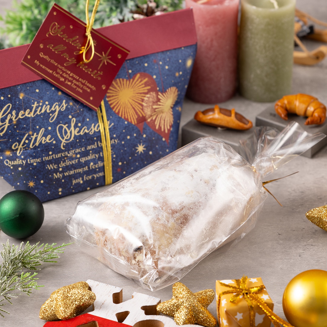 香り高いリキュールに漬け込んだ4種のフルーツとアーモンドを練り込んだシュトレンです。