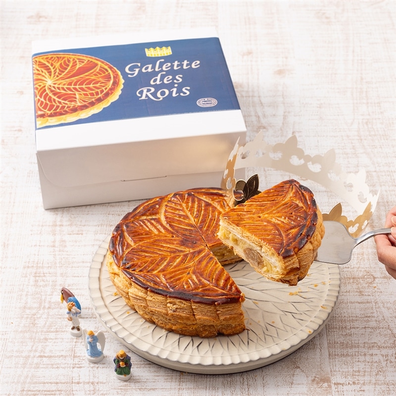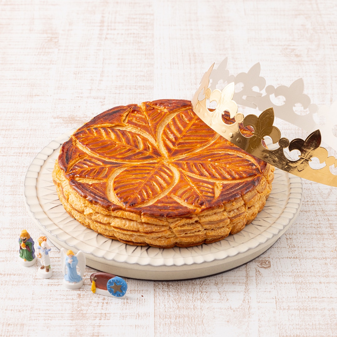 丁寧に焼き上げたパイ生地の食感と、アーモンドクリームの上品な味わいをお楽しみください。王冠と幸運のお守りフェーブ(陶器の人形)付き。