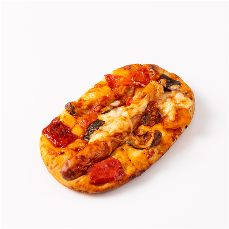 小麦粉(国内製造)、ポークソーセージ、グリル野菜ミックス(ズッキーニ、赤ピーマン、黄ピーマン、なす)、ラタトゥイユフィリング(グリルズッキーニ、トマト・ピューレーづけ、たまねぎ、あらごしトマト、グリル赤ピーマン、グリル黄ピーマン、グリルなす、トマトペースト、その他)、トマトソース、ナチュラルチーズ、発酵種、小麦たん白、食用オリーブ油、パン酵母、砂糖、食塩、乳等を主要原料とする食品、塩こうじ(米こうじ、食塩)、卵/加工デンプン、pH調整剤、増粘剤(加工デンプン)、リン酸塩(Na)、調味料(アミノ酸)、セルロース、酸化防止剤(ビタミンC)、ビタミンC、発色剤(亜硝酸Na)、(一部に乳成分・卵・小麦・大豆・鶏肉・豚肉・ゼラチンを含む)