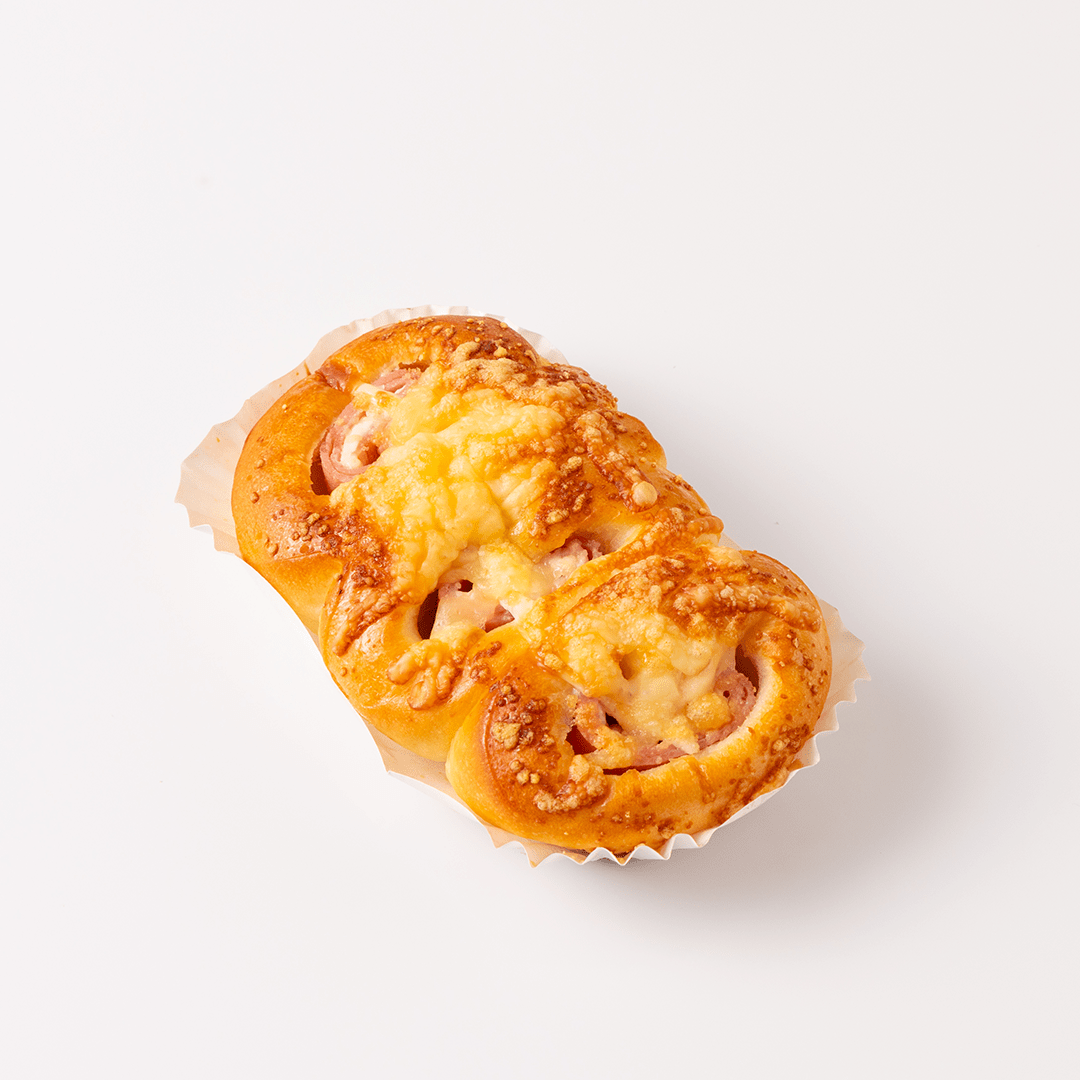 〇 ちぎれるハムチーズ:ハムとカマンベールチーズクリームを食パン生地で包み、さらに2種類のチーズをのせて焼き上げました。