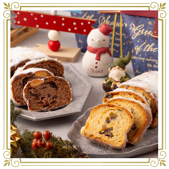 香り高いリキュールに漬け込んだたっぷりのレーズン、アーモンド、薄く伸ばしたマジパンを巻き込んだ「シュトレン」、ベルギー産チョコレート、洋酒に漬け込んだクランベリー、レーズン、りんごプレザーブとナッツを贅沢に練り込んだ「ショコラシュトレン」の2種類のシュトレン食べ比べセットです。