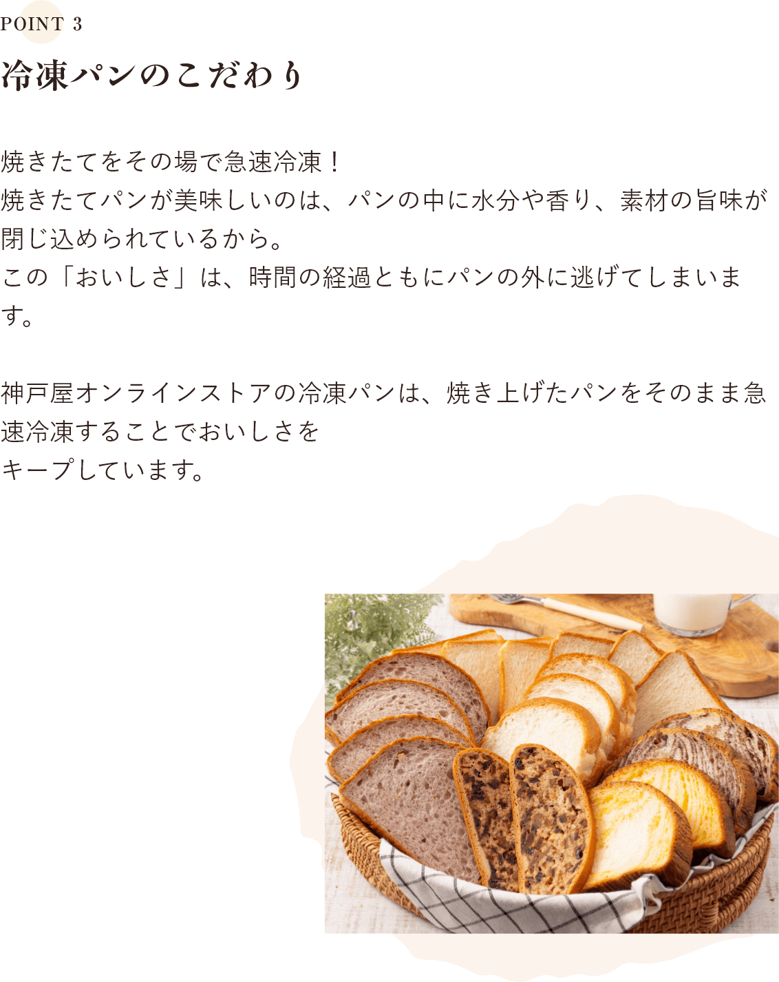 この度は神戸屋オンラインストアをご利用いただき、誠にありがとうございます。 当店では、ご自宅で焼きたてを手軽に楽しめる冷凍パンをはじめ、焼き菓子や、人気のアップルパイなど、食卓を豊にする商品を多数ご用意しています。 本日は神戸屋についてまだよく知らない方に向けて、 神戸屋のこだわりや取り組みをご紹介いたします!