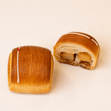 「折り込み生地」の課題として、りんごとアールグレイという私の好きな組み合わせで制作しました。美しい層が映える外観に加え、アールグレイ風味のアーモンドクリーム、そしてソテーとフレッシュの2種類のりんごを使用。アールグレイの芳醇な香りとりんごの甘み、生地のパリパリとした食感が際立つ作品に仕上がりました。