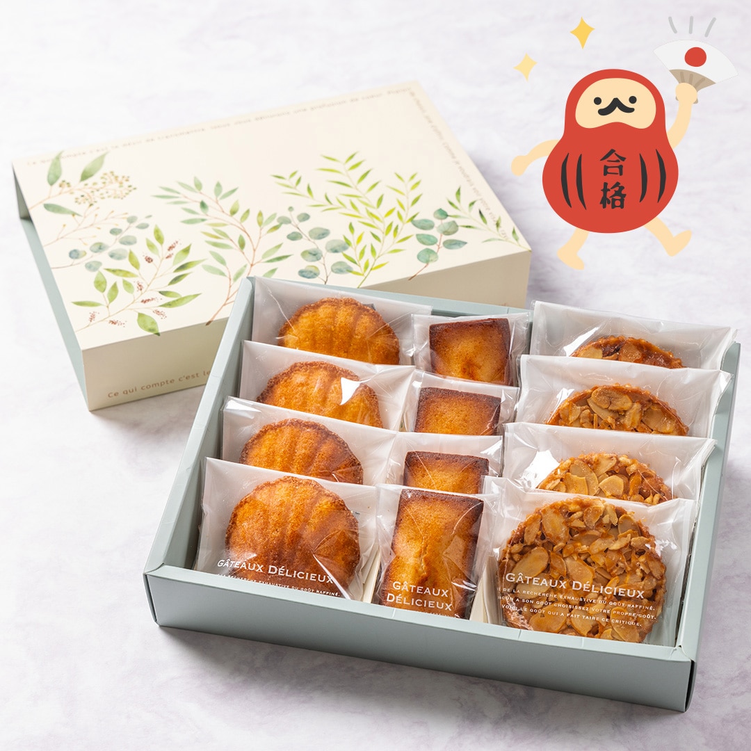 セット内容:アーモンドの香り、バターのしっとりとした風味が楽しめる「マドレーヌ」、アーモンドの香ばしい香り、焦がしバターの豊かな風味が楽しめる「フィナンシェ」、クッキー生地に香ばしいキャラメルアーモンドをのせて焼き上げた「フロリンティーヌ」各4個