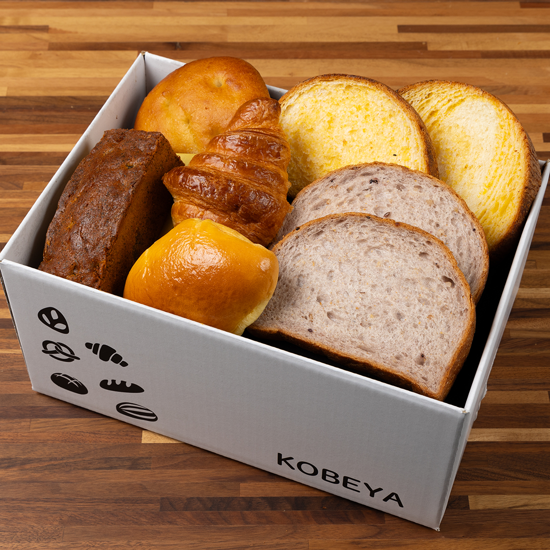 神戸屋オンラインストア人気の食事パンとスイーツ6種類<神戸屋 豊新(ゆたか)、やわらか15穀 2枚入(厚切り)、クロワッサンプリュス、塩麹湯種のフォカッチャ、クリームパン、オレンジケーキを詰合わせました。