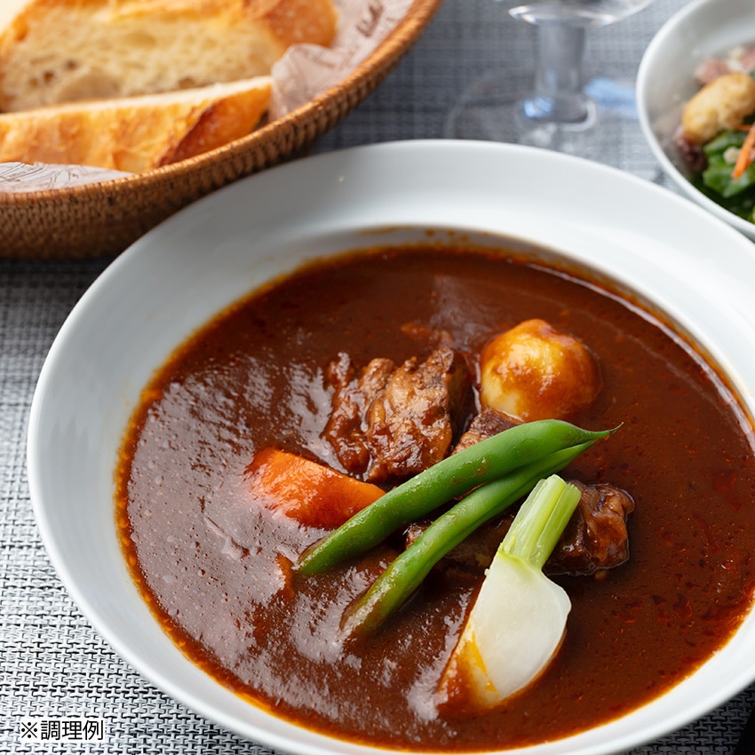 牛肉(アメリカ産)、野菜(じゃがいも、人参)、デミグラスベース(ブイヨン、野菜ソテー、牛すじ、その他)、ビーフブイヨン、野菜ペースト(玉ねぎ、人参、セロリ、その他)、ビーフペースト、ルウ(小麦粉、調製ラード)、赤ワイン、ビーフミートペースト、ビーフオイル、トマトペースト、食塩/増粘剤(加工デンプン)、調味料(アミノ酸)、カラメル色素、(一部に小麦・牛肉・大豆・鶏肉・豚肉を含む)