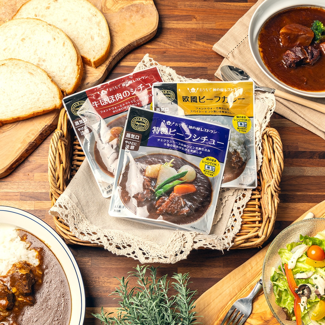 2024.04.01より、袋ごと電子レンジで温めるよう、リニューアルしました! 神戸屋レストラン人気の味を ご家庭でお楽しみいただける「セレクトデリ」シリーズ。やわらかなごろっとお肉がとろけるおいしさの「牛ほほ肉のシチュー」、デミグラスベースの赤ワイン本格仕込みの「特製ビーフシチュー」、フォンドボーで煮込んだきわだつ香りとコクの「欧風ビーフカレー」が2袋ずつ入った詰め合わせセットです。ギフトにもどうぞ。