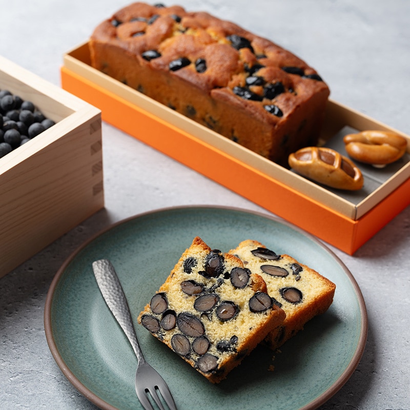 どこを切っても大粒の丹波黒豆が顔を出す、重量感たっぷりのパウンドケーキです。
