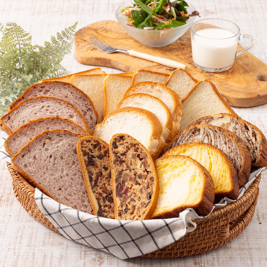 時間のない朝食にも焼き立てのおいしさが楽しめる6種の食パン (神戸屋 パン・ド・ミ 3枚入×2、イギリス 3枚入×1、やわらか15穀 2枚入(厚切り)×2、神戸屋 あらた×1、神戸屋 ゆたか×1、フッツェルブロート 2枚入×1)のセットです。