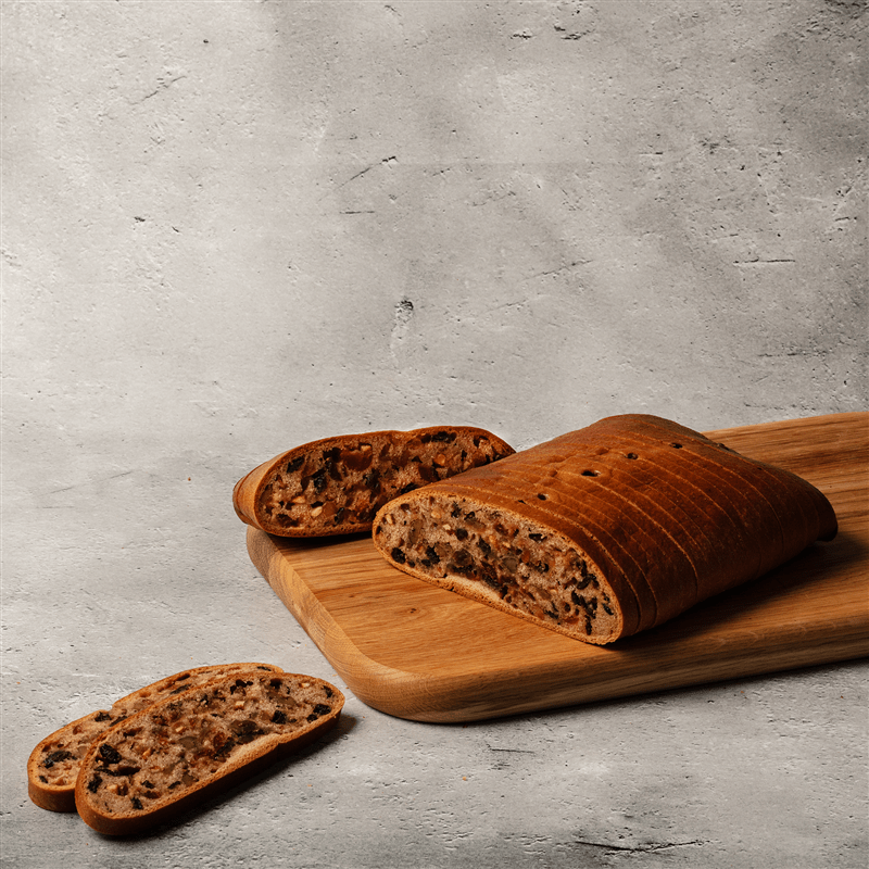 りんごやチェリー、レーズン、オレンジピールとくるみをパン生地に包んでじっくり焼き上げました。 リキュールとシナモンが香るケーキのようなパンです。