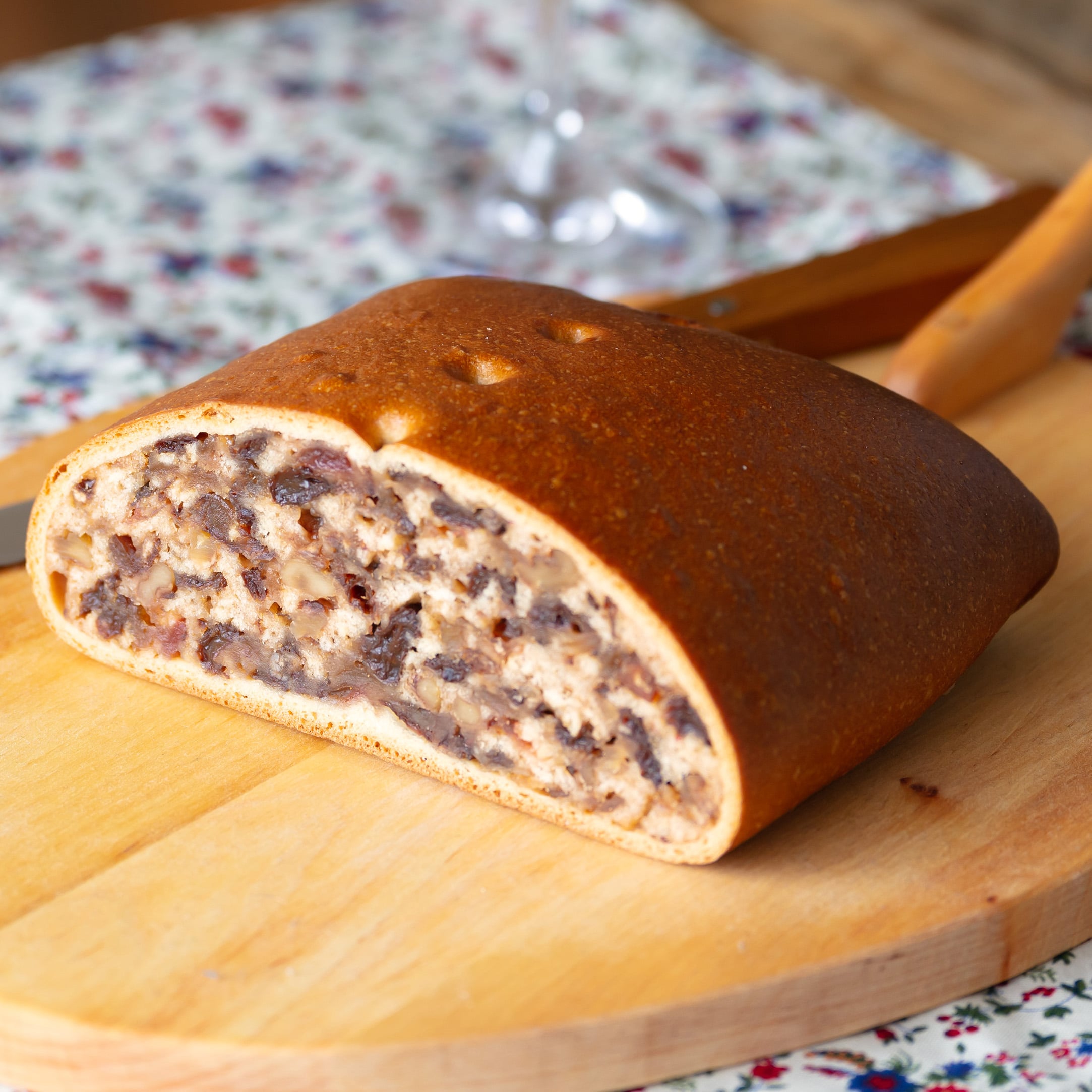 りんごやチェリー、レーズン、オレンジピールとくるみをパン生地に包んでじっくり焼き上げました。