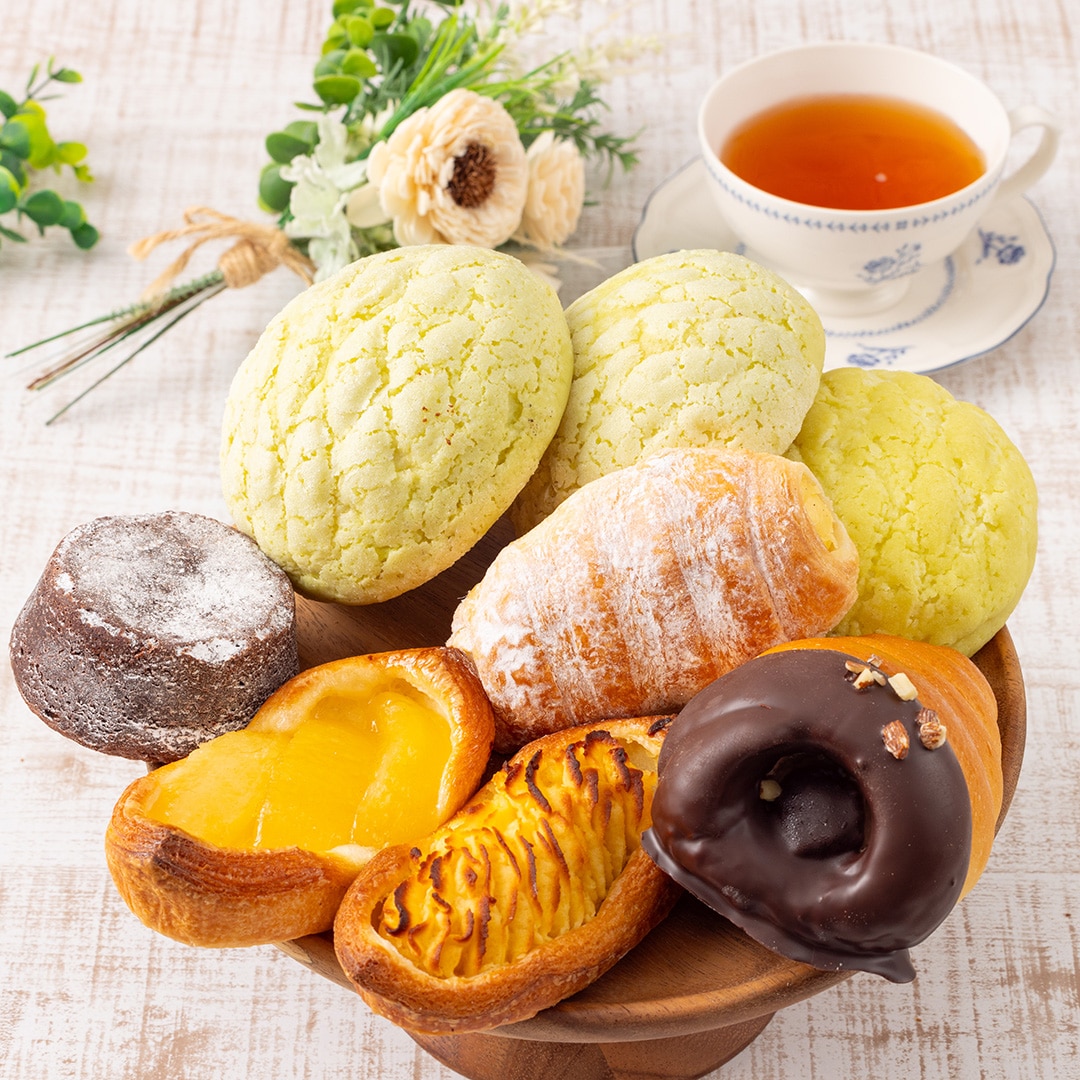 蒜山ジャージーカスタード×1個、チョコカスタードコロネ×1個、スペシャルメロンホイップ×2個、メロンパン(メロン果汁入)×1個、クーベルチュールのフォンダンショコラ×1個、たっぷり青森りんご×1×1個、なると金時のスイートポテト×1個が入っているお得なセットです。