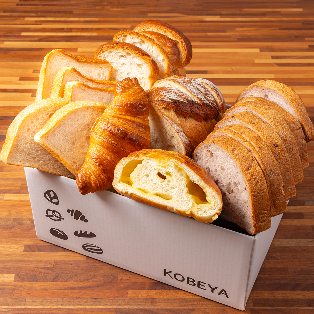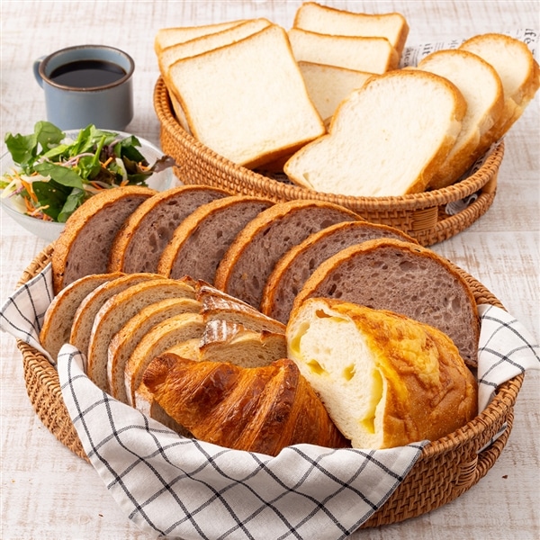 時間のない朝食にも焼き立てのおいしさが楽しめる6種の食パン (やわらか15穀(5枚スライス)×1、全粒粉入りブレッド(スライス)×1、チーズフランス×1、イギリス 3枚入×1、神戸屋 パン・ド・ミ 3枚入×2、クロワッサンプリュス×1)のセットです。