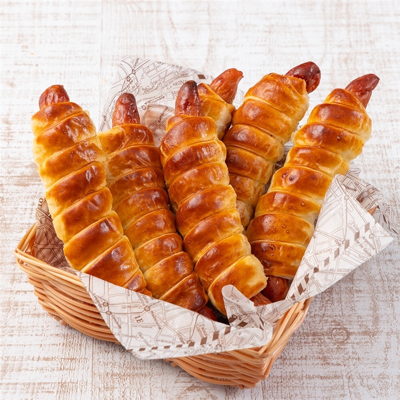 粗挽きソーセージにパイ生地を巻いて焼き上げたボリューム感たっぷりの総菜パンです。