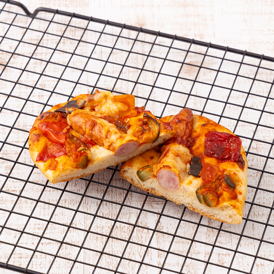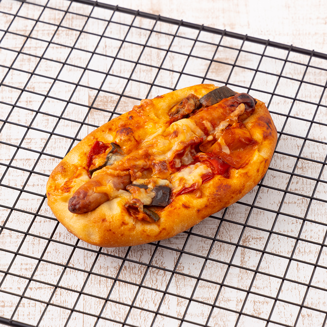 小麦粉(国内製造)、ポークソーセージ、グリル野菜ミックス(ズッキーニ、赤ピーマン、黄ピーマン、なす)、ラタトゥイユフィリング(グリルズッキーニ、トマト・ピューレーづけ、たまねぎ、あらごしトマト、グリル赤ピーマン、グリル黄ピーマン、グリルなす、トマトペースト、その他)、トマトソース、ナチュラルチーズ、発酵種、小麦たん白、食用オリーブ油、パン酵母、砂糖、食塩、乳等を主要原料とする食品、塩こうじ(米こうじ、食塩)、卵/加工デンプン、pH調整剤、増粘剤(加工デンプン)、リン酸塩(Na)、調味料(アミノ酸)、セルロース、酸化防止剤(ビタミンC)、ビタミンC、発色剤(亜硝酸Na)、(一部に乳成分・卵・小麦・大豆・鶏肉・豚肉・ゼラチンを含む)