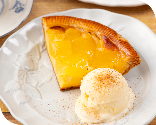 パイの器に国産りんごのプレザーブをたっぷり使用した贅沢なアップルパイです。 カスタードとアーモンドクリームを合わせ、りんごをたっぷり乗せ焼き上げています。