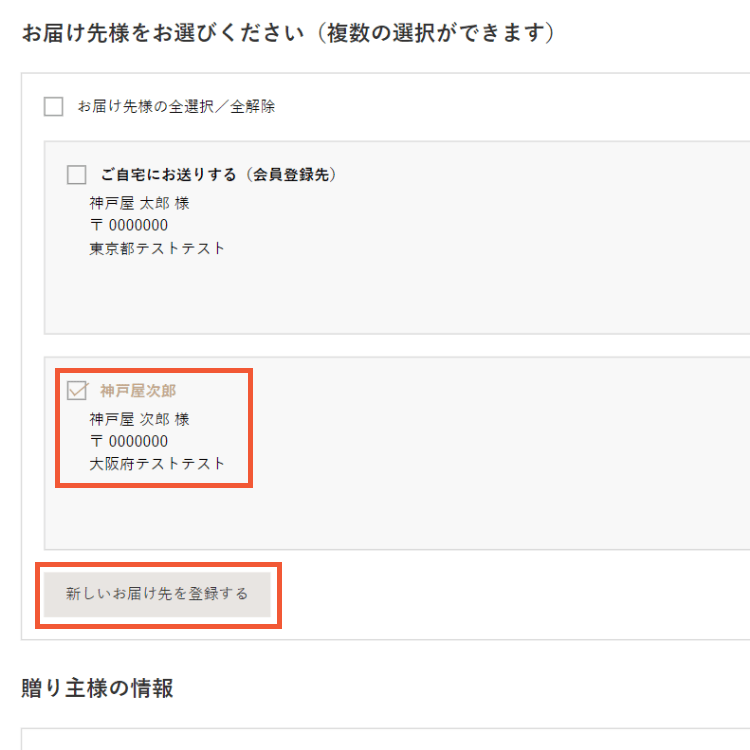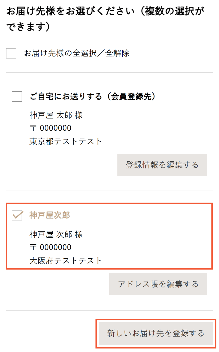 お届け先が登録されていない場合は、「新しいお届け先を登録する」から登録します。
