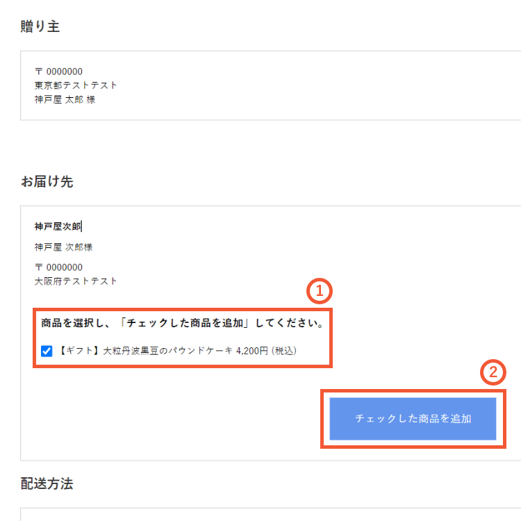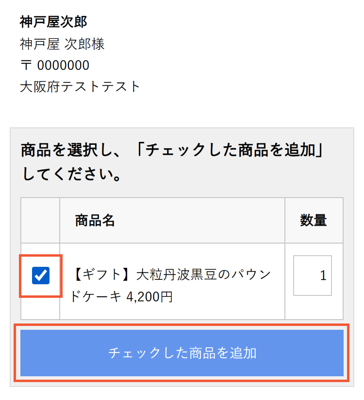 ②で選択したお届け先に贈りたい商品を選択し、「チェックした商品を追加」をクリックします。