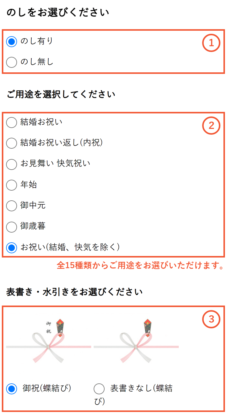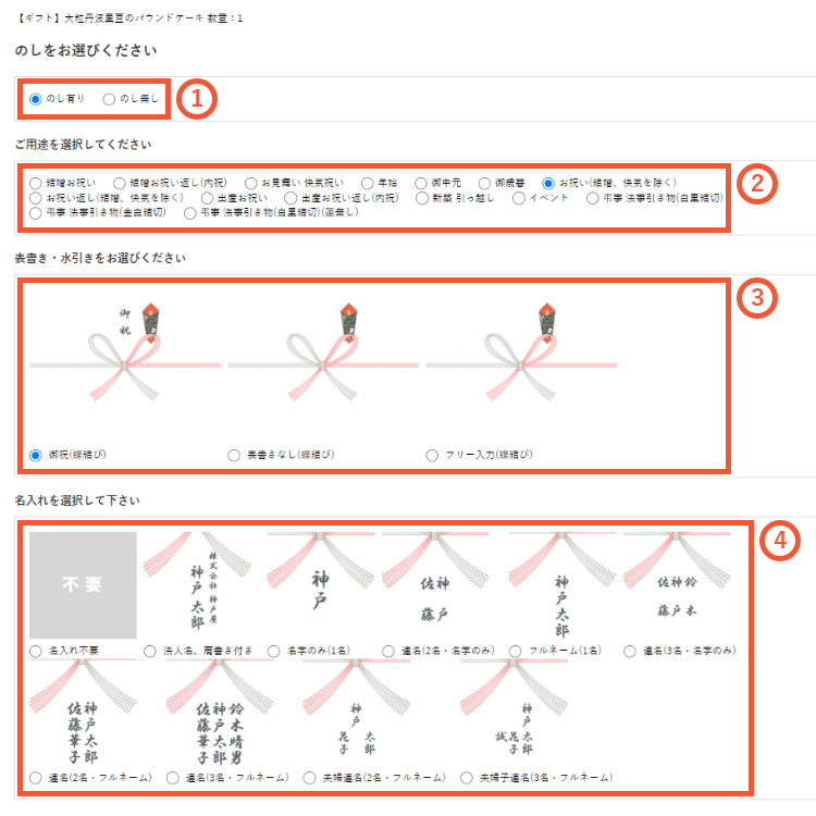 のしをご希望の方は、種類や表書き、名入れ等の設定が可能です。