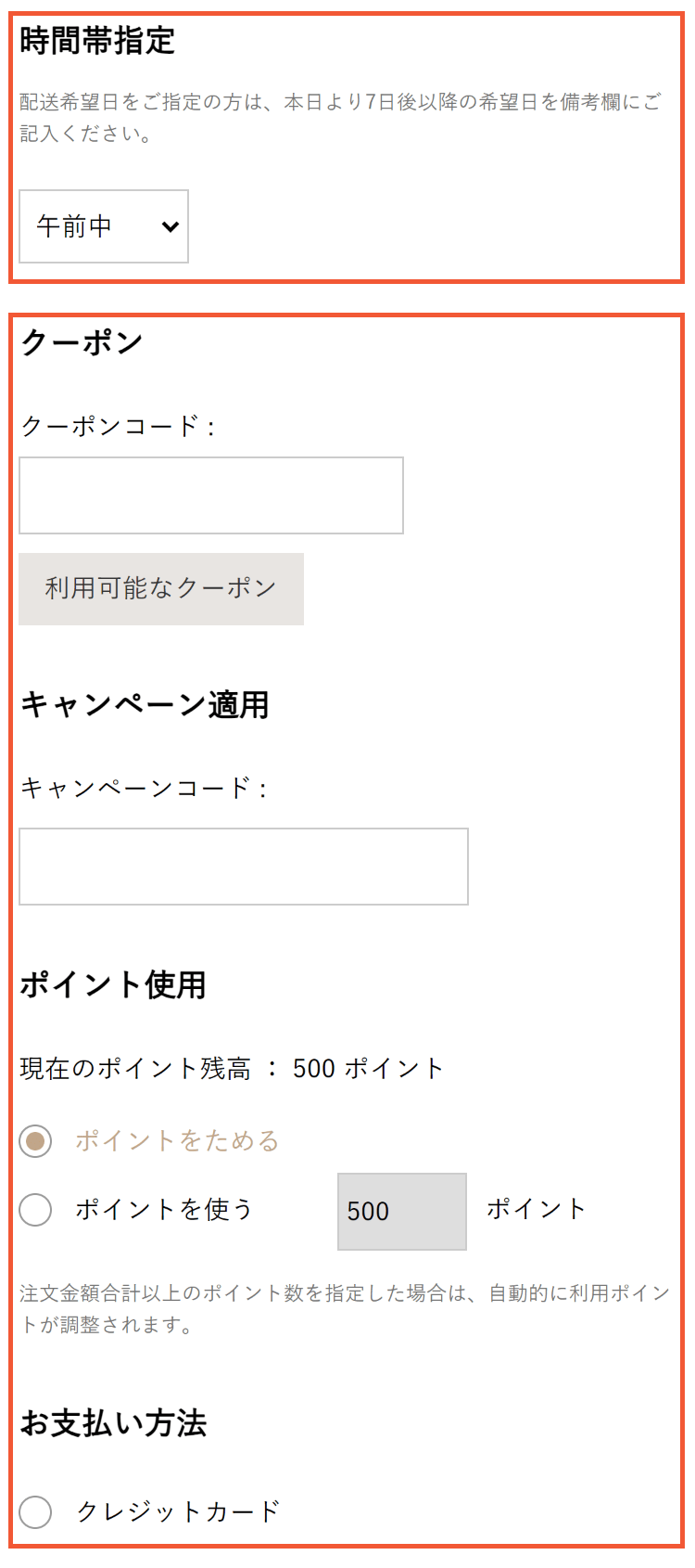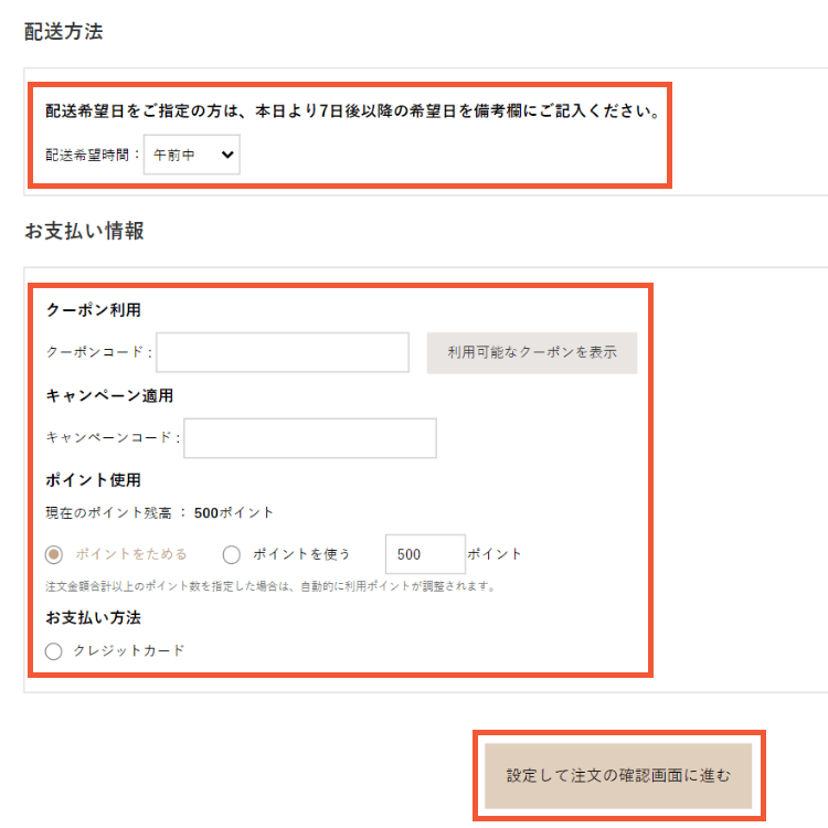 のし・ラッピング設定ができましたら、配送日時やお支払い情報を入力します。