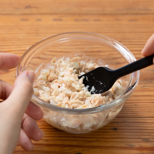 ボウルに汁気を切ったツナ缶、みじん切りにした玉ねぎ、マヨネーズ、粗挽き黒こしょうを混ぜ合わせます。