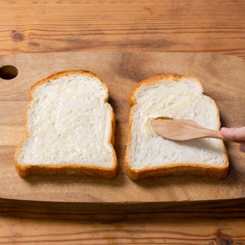バターを塗っていない面にスライスチェダーチーズ、①をのせ、もう1枚のイギリスではさみます。