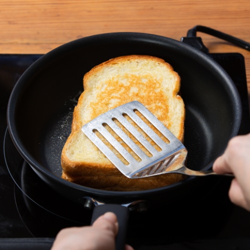 フライパンを中火で熱し、フライ返しで軽くおさえながら片面2~3分ずつ焼きます。半分に切って完成です。