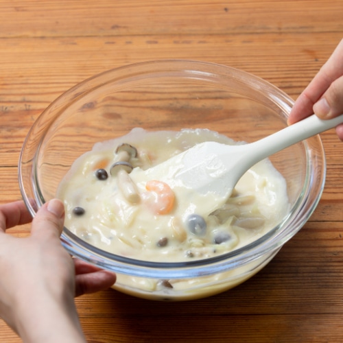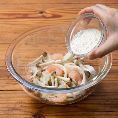 耐熱容器に、塩水で解凍したシーフードミックス、薄切りにした玉ねぎ、小房に分けたしめじ、小麦粉を入れて混ぜ合わせます。