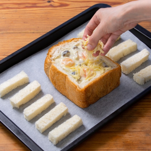 クッキングシートを敷いた天板に④を並べ、くり抜いた部分に③を流し入れます。とろけるチーズをのせ、250℃に予熱したオーブンで5~6分ほど焼きます。取り出してパセリをふって完成です。