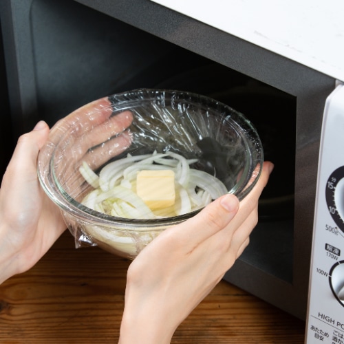 ボウルに5mm幅の薄切りにした玉ねぎを入れ、バターを加えて、ふんわりラップをかけます。レンジ600Wで5分加熱し、全体を混ぜ合わせます。ラップをかけずに再度レンジ600Wで4~8分加熱します。様子を見て途中で取り出して混ぜ合わせてください。