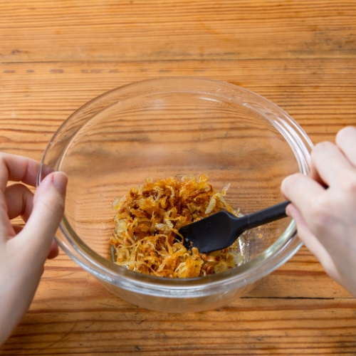 玉ねぎが茶色に色づいたら取り出して、コンソメを加えて混ぜ合わせます。
