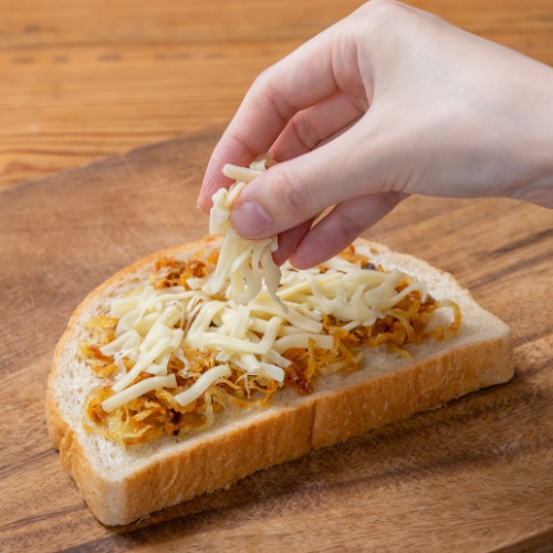 バイツェンブロートに②、とろけるチーズをのせて200℃トースターで3~5分加熱します。粗挽き黒こしょう、パセリをトッピングして完成です。